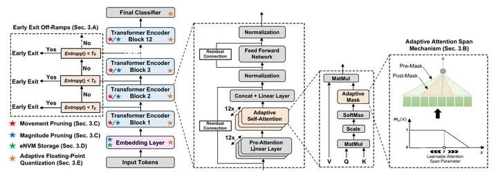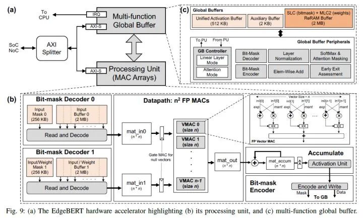 嵌入层:保存了 Embedding 向量。EdgeBERT 在进行下游任务 fine-tune 时一般不对嵌入层进行修改。这类参数相当于只读参数,只对快速读取有较高要求,同时希望能够在掉电时依然保持原有数据来降低数据读写开销,因此适用耗能低、读取速度快的 eNVM(Embedded Non-Volatile Memory,嵌入式非挥发性记忆体)。本文选取的是基于 MLC 的 ReRAM,一种低功耗、高速度的 RAM。
