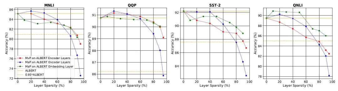 QQP 的 Transformer 参数被 mask 掉 80%,MNLI、SST-2、QNLI 的 Transformer 参数被 mask 掉 60% 后,性能可以仅下降 1 个百分点。