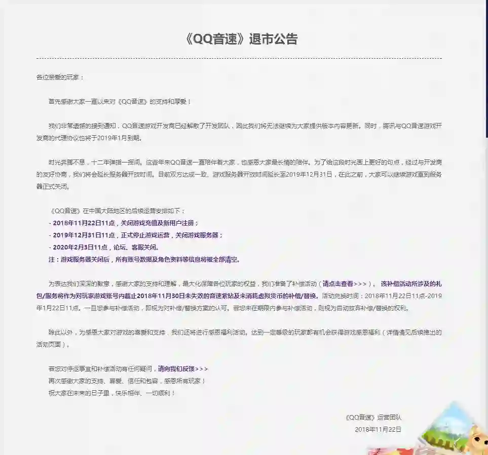 综合以上原因,《QQ音速》国服决定将于2018年11月22日,关闭游戏充值及新用户注册,2019年12月31日彻底停服。