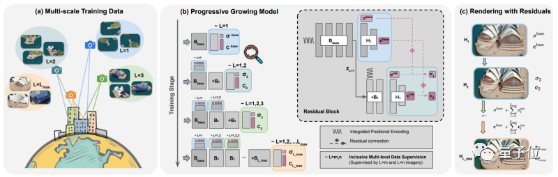在每个训练阶段附加一个额外的块来扩展模型。每个块都有自己的输出head,用于预测连续阶段之间的颜色和密度残差,促使块在近距离观察中关注新兴细节;