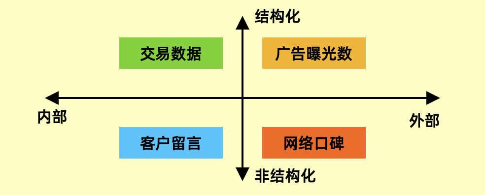 1)企业内部的结构化数据。是指企业自有、可用数值量化表现的数据。比如今年总营收 = 30万、客单价 = 700元/人、整体退货率 = 7% 等等。