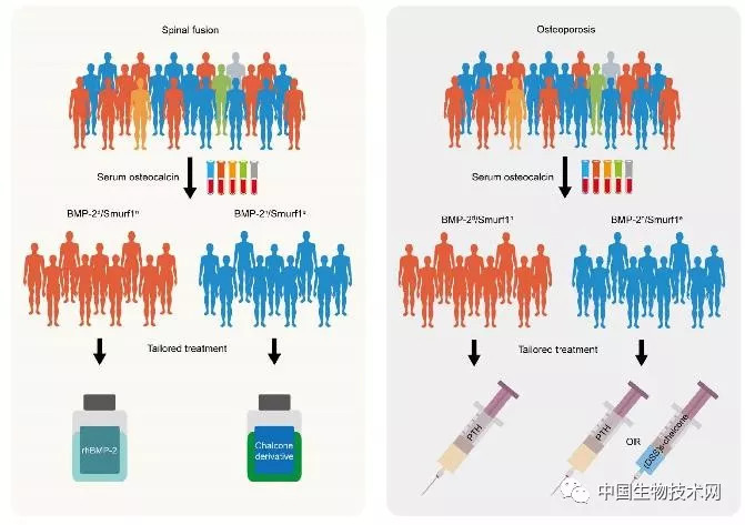 论文的通讯作者-香港浸会大学罗守辉骨与关节疾病转化医学研究所(TMBJ: http://tmbj.hkbu.edu.hk/)的张戈教授介绍说:“BMP信号通路在成骨细胞介导的骨形成过程中发挥重要作用。BMP分子启动该信号通路,从而激活成骨相关基因的表达。然而,Smurf1泛素化降解BMP通路的关键分子,对骨形成发挥负调控作用。年龄相关性骨质疏松病人可以基于骨内BMP-2水平和Smurf1活性分成不同亚群。有意思的是,其中一个大的亚群具有正常的BMP-2水平和升高的Smurf1活性(BMP-2n/Smurf1e),另一个亚群具有降低的BMP-2水平和正常的Smurf1活性(BMP-2d/Smurf1n)。BMP-2d/Smurf1n亚群接受重组BMP-2治疗后局部成骨治疗后的脊柱融合得到了显著改善,BMP-2n/Smurf1e亚群却对重组BMP-2无响应。静默Smurf1可以改善BMP-2n/Smurf1e亚群患者的成骨细胞分化能力,提示Smurf1活性升高是重组BMP-2治疗效果在BMP-2n/Smurf1e亚群患者不满意的潜在机制,抑制Smurf1活性是改善BMP-2n/Smurf1e亚群患者脊柱融合的潜在治疗策略。”