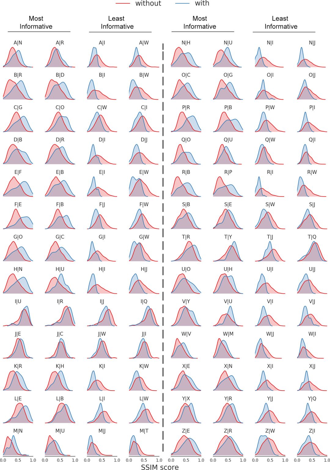 通过这种新颖的字形堆栈设计,跨网络信道学习不同字形之间的相关性得以实现,并实现风格自动迁移。下图通过结构类似性(SSIM)指标在包含 1500 个字体样例的随机集合上展示了这种相关性。计算每个生成字形与其真实字形之间的结构相似性时,当一次观察到一个字母时,共发现了 25 种分布。这些曲线图显示了当观察到字母 β(蓝色)时生成字母 α 的分布 α|β 与当给出除 β 以外的任何其它字母(红色)时生成字母 α 的分布 α|β。在生成 26 个字母中的每一个字母时,两个信息量最大的给定字母和两个信息量最少的给定字母的分布如图所示。例如,从图的第五行来看,与其他字母相比,字母 F 和 B 在生成字母 E 方面是最有信息贡献的,而 I 和 W 是信息最少的。其他例子中,O 和 C 是构造 G 的最具指导性的字母,R 和 B 是生成 P 的最具指导性的字母。