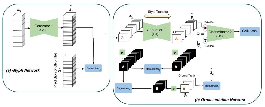 多内容 GAN 模型包括用于预测粗糙字形形状的堆叠 cGAN 架构和用于预测最终字形颜色和纹理的装饰网络(ornamentation network)。第一个网络称为 GlyphNet,用于预测字形掩码;第二个网络称为 OrnaNet,用于微调从第一个网络生成字形的颜色和装饰。每个子网络遵循条件生成对抗网络(cGAN)的结构,并修改该结构以达到使字形风格化或装饰预测的特定目的。