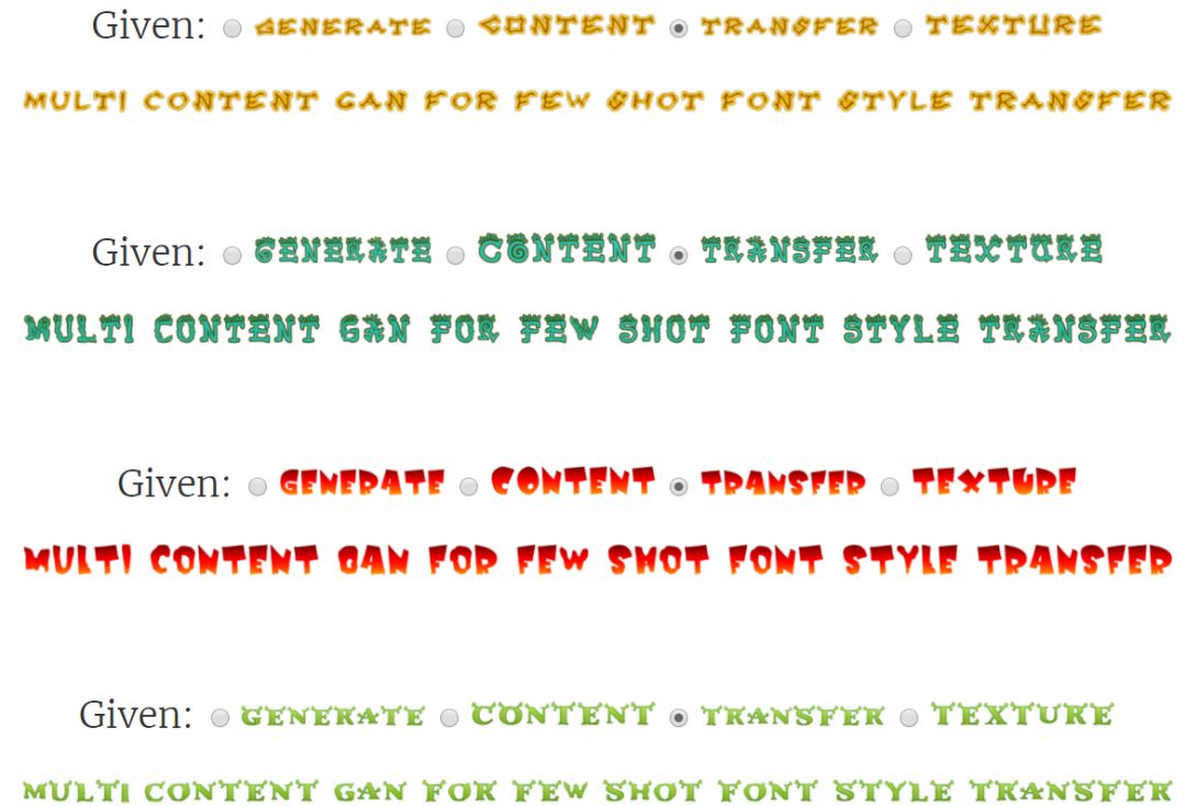 [2] Samaneh Azadi, Matthew Fisher, Vladimir Kim, Zhaowen Wang, Eli Shechtman, and Trevor Darrell. "Multi-Content GAN for Few-Shot Font Style Transfer." CVPR 2018.