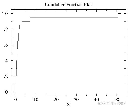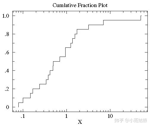举个例子,对于数据集 {1.26, 0.34, 0.70, 1.75, 50.57, 1.55, 0.08, 0.42, 0.50, 3.20, 0.15, 0.49, 0.95, 0.24, 1.37, 0.17, 6.98, 0.10, 0.94, 0.38},先对其排序为 {0.08, 0.10, 0.15, 0.17, 0.24, 0.34, 0.38, 0.42, 0.49, 0.50, 0.70, 0.94, 0.95, 1.26, 1.37, 1.55, 1.75, 3.20, 6.98, 50.57}。其中比0.24小的一共有4个,占数据集的 1/5,所以0.24的累积分布值是0.2,依次类推我们可以画出累积分布图。