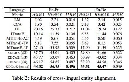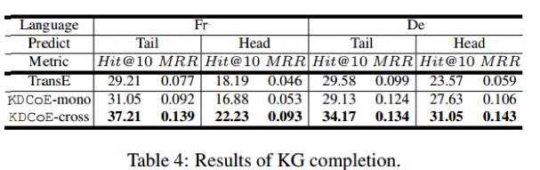 (2)证明KDCoE在Zero-shot实体对齐以及跨语言知识图谱补全(Cross-lingual KG Completion)任务上的有效性;