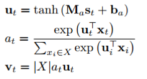 其中,ut 是由 GRU 中 st 产生的隐藏表示,attention 权值 at 则是由一个 softmax 函数计算得到,反映的是单词 xt 对于序列 X 的重要性,而后依据此权重与隐藏表示可以得到 self-attention 的输出 vt,|X|(输入序列的长度)用于防止 vt 失去原有的规模。