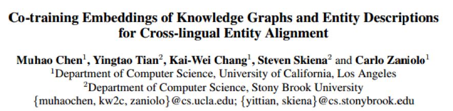 考虑到多语言知识图谱中具有对实体的文字性描述,文章提出一种基于嵌入(Embedding)的策略:通过利用图谱中实体的文字描述,对仅包含弱对齐(KG中的inter-language links,ILLs)的多语图谱做半监督的跨语言知识推理。