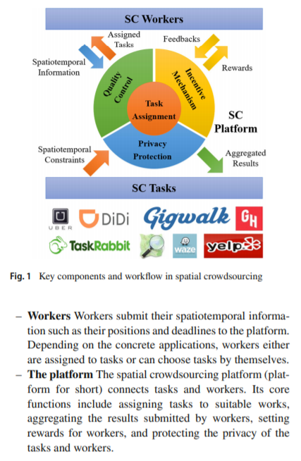 众包是一种计算范式,在这种范式中,人类积极参与计算任务,特别是那些本质上人类比计算机更容易完成的任务。空间众包是移动互联网和共享经济时代众包中日益流行的一种,任务是时空的,必须在特定的地点和时间完成。事实上,空间众包激发了最近一系列的产业成功,包括城市服务的共享经济(Uber和Gigwalk)和时空数据收集(OpenStreetMap和Waze)。本调查深入探讨了空间众包的独特性带来的挑战和技术。特别地,我们确定了空间众包的四个核心算法问题: (1)任务分配,(2)质量控制,(3)激励机制设计,(4)隐私保护。我们对上述四个问题的现有研究进行了全面和系统的回顾。我们还分析了具有代表性的空间众包应用程序,并解释了它们是如何通过这四个技术问题实现的。最后,我们讨论了未来空间众包研究和应用中需要解决的开放问题。