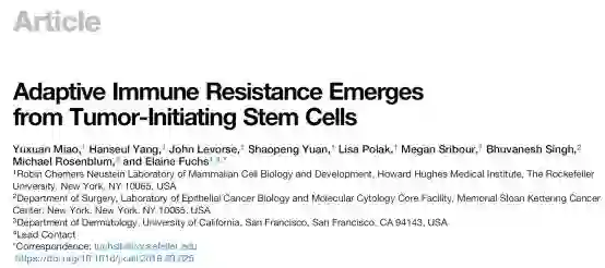 参考文献:Michael Rosenblum,Elaine Fuchs.Adaptive Immune Resistance Emerges from Tumor-Initiating Stem Cells