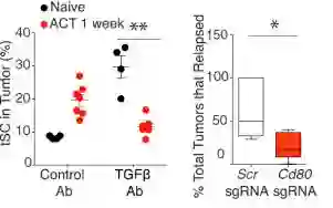 为了解决这个问题,来自Elaine Fuchs实验室的研究人员设计了一个鳞状细胞癌(SCC)模型。使用单细胞RNA测序(RNA-seq)和谱系追踪,他们发现转化生长因子β(TGF-β)在肿瘤复发中起到关键作用。随后他们发现这一分子通过促进CD80的表达进而使部分肿瘤细胞逃逸于机体的免疫查杀。同时,研究人员发现阻断TGFβ蛋白质或可有效防止肿瘤复发的情况出现。这一研究结果发表于《Cell》杂志。