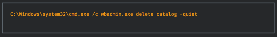 接下来,再次利用主机上的cmd.exe执行,我们可以看到恶意软件作者使用wbadmin.exe;有必要向不熟悉wbadmin的读者解释一下,这是现代操作系统上的ntbackup的替代者。