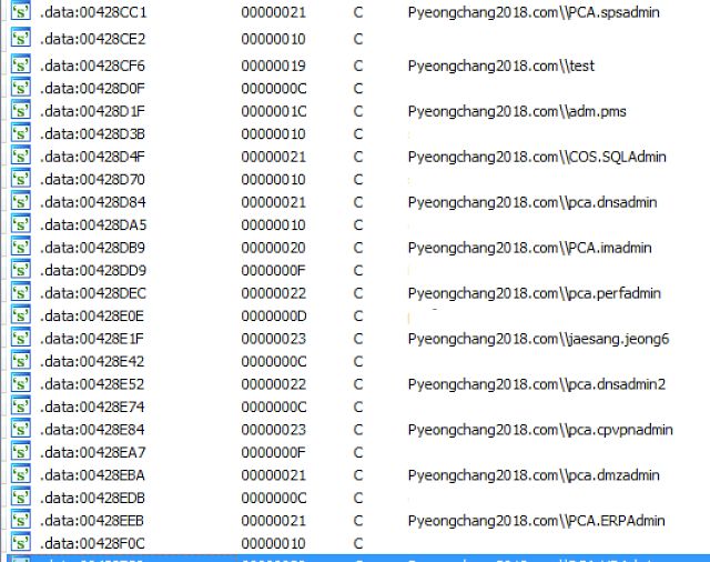 如你所见,企图利用的域名与2018年平昌冬奥会有关。恶意软件作者知道冬奥会基础设施的许多技术细节,比如用户名、域名、服务器名称,显然还知道密码。我们发现了二进制文件中的44个帐户。