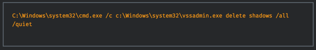 该恶意软件的破坏性部分在受害者机器上初始执行期间就开始了。正如讨论的那样,初始的恶意软件执行导致多个文件写入到磁盘。在此之后,恶意软件通过开始执行恶意破坏性部分,继续传播开来。通过利用主机上的cmd.exe,恶意软件先使用vssadmin删除系统上所有可能的卷影副本: