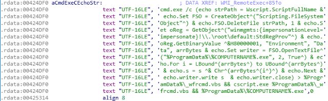 网络传播使用PsExec和WMI来执行(通过Win32_Process类)。这是远程执行的代码: