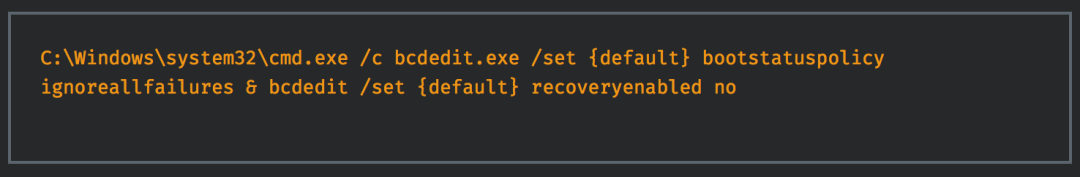 攻击者在这条破坏性路径上采取的下一步是再次利用cmd.exe,但这回使用bcdedit(一种用于启动配置数据信息的工具),确保Windows恢复控制台并不试图修复主机上的任何内容。