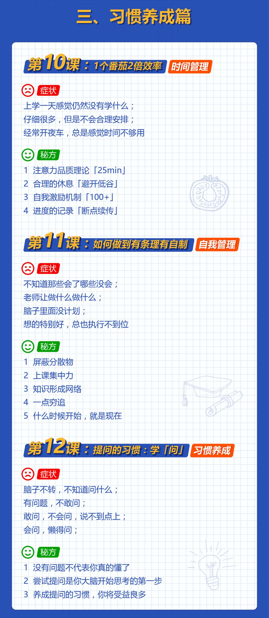 我们保证,所有的课程都是学霸的真实案例,大到学习方法,如:调节心态、高效学习法;