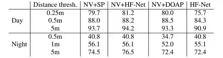 表4. Aachen Day-Night数据集性能估计。表中数据为不同距离误差阈值下的召回率。