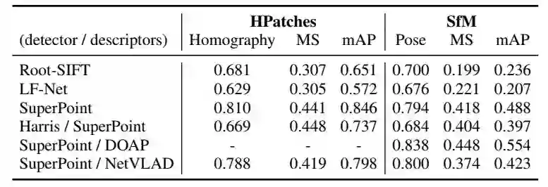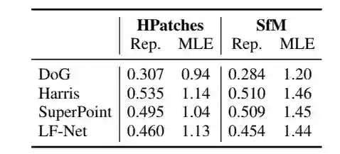 表1. 特征点检测子性能评估。Rep指重复性,MLE指平均定位误差。