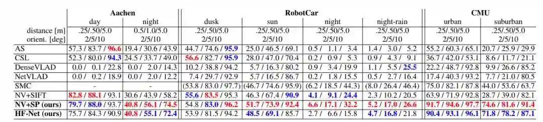 表3. 在Aachen Day-Night, RobotCar Seasons, 和CMU Seasons三个数据集上的定位性能的评估。本文主要统计了不同距离、不同方向阈值下的定位召回率,重点标出了最优和次优的算法。X+Y表示采用X作为全局描述子、Y作为局部特征点描述子的层级定位算法。由于SMC使用了额外的语义信息,因此在RobotCar数据集的比较中将其排除在外。