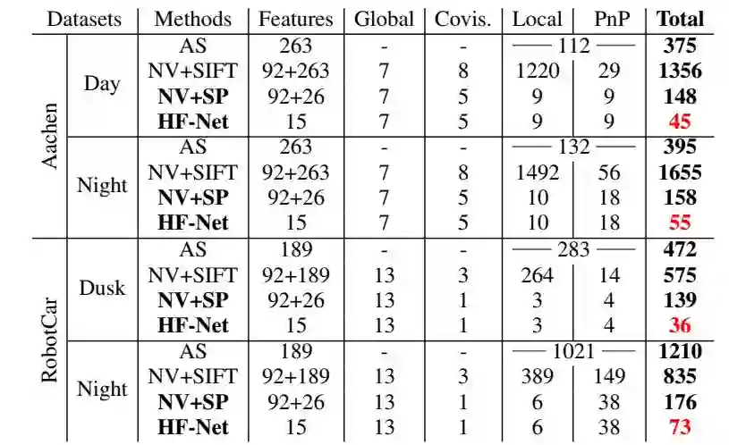 表5. 层级定位不同步骤的时间消耗,这些步骤包括:特征提取、全局搜索、地点聚类、局部匹配、PNP姿态估计。基于SIFT或者CNN的特征提取和描述子匹配运行在GPU上,其他的操作在CPU上。本文标出了每个序列上最快的方法。基于HF-Net的定位方法是当前最快的方法,且比AS方法快10倍。