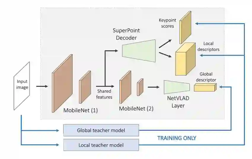 图2. HF-Net能够使用一个网络完成三项任务:生成全局图像描述子,检测特征点,生成特征点描述子。三个任务的“头部网络”(指从输出层算起的后面一部分网络)通过在各自“老师网络”的指导下进行联合的训练。