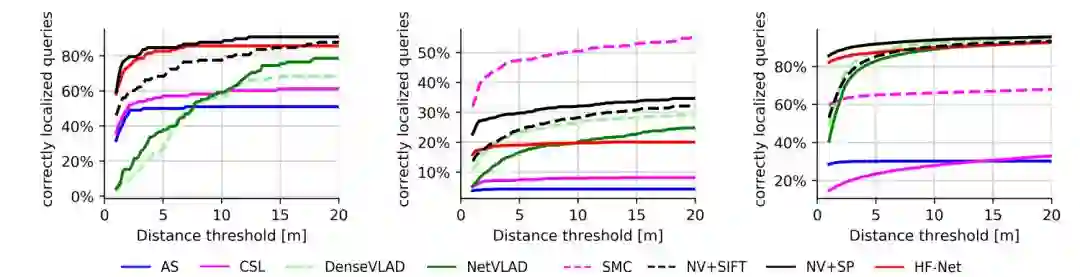 图3. 在Aachen night (左), RobotCar night-all (中) and CMU suburban (右)三个数据集上定位误差的分布。在Aachen数据集上,HF-Net和NV+SP性能相近,且由于其他方法。在RobotCar数据集上,HF-Net比NV+SP性能差一些,说明知识蒸馏方法的局限性。在CMU数据集上,HF-Net比其他方法性能提升显著,尤其是在小的定位阈值的情况下。