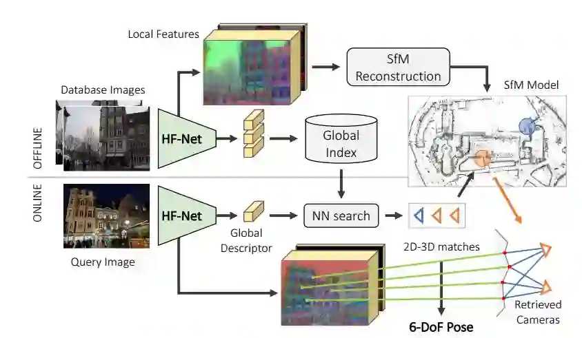 如图1所示,本文的算法主要分为离线地图构建和在线定位两个阶段。在离线阶段,使用本文的HF-Net来提取每张图像的全局描述子,并以此建立图像的索引数据库。同时提取图像的特征点,并利用这些特征点进行SfM,得到场景的稀疏三维模型,最为相机位姿估计的三维地图。在线定位阶段主要分为三部分:图像索引、地点聚类、6-DoF位姿估计。图像索引:通过对图像的描述子的检索,确定候选的匹配图像;地点聚类:根据候选匹配图像对应的三维位姿,将相近的图像合为同一个“地点”;6-DoF位姿估计:通过与候选“地点”对应的二维特征点的匹配,得到观测图像二维点与地图三维点的对应关系,而后在RANSAC框架下,计算相机的位姿。
