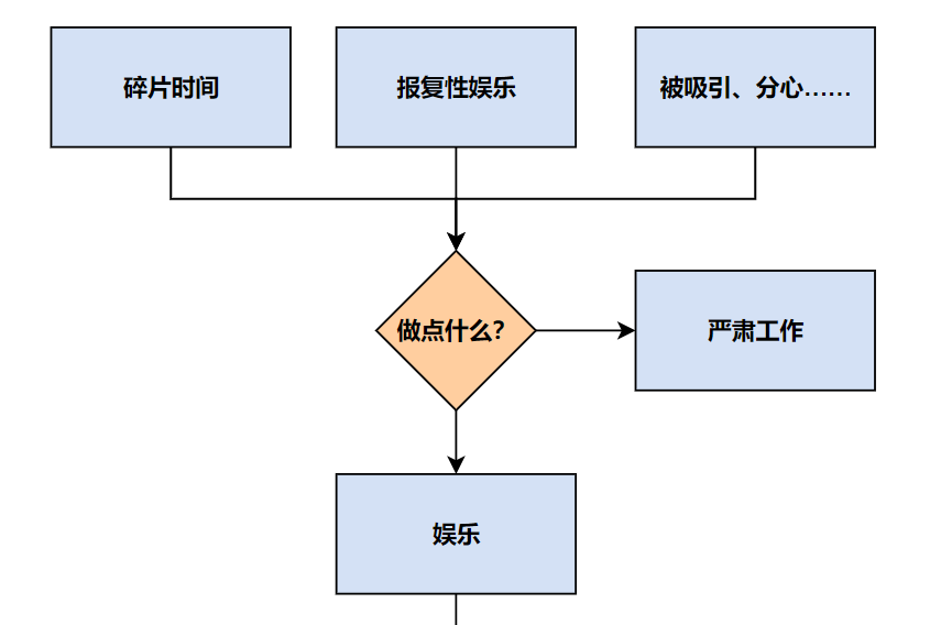 生活中有无数的事情可以打乱我们的安排:突然提交来的需求、上司的电话、朋友的邀约……因此,碎片时间无法避免,我们只能接受它。解决问题的第一步是正确地认识问题本身,再考虑如何着手解决问题。那么,如果用工作填满碎片时间呢?我目前正在实践的方法是:把诸如查阅书籍、下载资料、沟通对接的工作打散到每一个碎片里,当我不确定未来 1-2 小时内是否会被打断时,我一般都会优先完成这些工作。它们不需要很高的专注程度,随时可以开始或放下。这个技巧的核心是把无法精确地规定时间的工作放在碎片时间处理。我曾尝试过给这类工作安排整块的时间,但最后要么就是根本无法按时完成,要么就是工作量太少,于是自我放纵地打开 B 站休息一下,再拖到最后一秒完成。这类工作也可能是很含糊的需求,例如「找几篇相关的文献」或「找一下 XX 课程的资源」。没有人能告诉你这些文献是否足够,或者你需要浏览多少网页才能找到一个可用的下载链接。你也不能保证自己不会被网页上的某个广告吸引注意力,被分心和打断工作流程。在碎片时间处理这些问题,除了最大化利用时间,也可以在你意志薄弱的时候强制把你拉回正轨。也许你的所有工作都需要集中注意力来完成,那么可以在碎片时间里回顾一下已完成的任务,想一想是否有遗漏,是否可以继续改进。这样跳出第一人称视角审视自己,或许可以帮你发现新的灵感。也可以更新一下自己的计划,只要是对未来工作有益都可以。为什么碎片时间尽量不要娱乐,尤其是在工作间隙?就像计算机进行任务切换需要在内存和硬盘中不断地交换数据一样,大脑在做不同的任务时调用的神经元也不同,需要时间调整和准备。在工作间隙娱乐后,很难再回到休息前的状态,也是这个道理。既然娱乐不了太久,还会影响工作效率,为何不单独留一块完整的时间给娱乐呢?