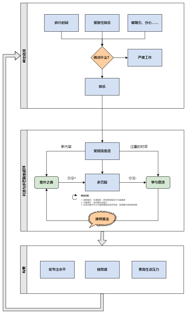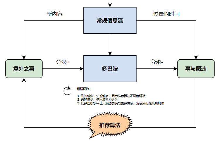 你是否有过这样的经历:当你忙到没有时间休息时,你根本不会想刷手机;只有当你闲下来喘息的时候,才会习惯性地掏出手机看两眼。类似的场景还有很多:学习或工作时的心流状态下更不容易被分心;处理得心应手的工作时感觉时间过得飞快……背后的原因在于我们的大脑此时被眼前的工作占据着,它拼尽全力地调用着和工作相关的神经元,而忽视了能够让你分心的其他事情。这是由大脑的特点决定的。大脑就像一台永不停歇的机器,总是需要思考些什么,即使睡觉时也不例外。工作或学习时,任务和挑战不断涌来,大脑游走其中,逐一处理。特别地,当面临富有挑战的工作,亦或是进入了心流状态时,大脑处于持续兴奋状态,不需要娱乐活动的刺激也能玩得很嗨。但当刺激不足时,大脑就会驱使你找寻其他新鲜的刺激来「喂饱」它。最简单的刺激物是什么呢?对日常习惯刷 B 站的同学来说,一定是下意识地打开 B 站,看看主页有没有新视频可看。看完刷一刷,又有一个,如此循环往复,不知不觉地刷了 1 个小时。偶尔意识到:「玩了这么久了,干活去吧?」时,还会用诸如「再看五分钟」这样的借口,让自己多玩半小时。「刺激」究竟从何而来?为什么我们明知道这样的刺激是有害的,却仍旧无法抵挡它?刺激感受与多巴胺——在神经系统中帮助细胞传送脉冲信号的神经递质——有着密不可分的关系。多巴胺能够影响我们的快感水平,高水平的多巴胺分泌可以使我们感到满足;相对地,若多巴胺分泌减少,我们会觉得不爽。正常的多巴胺分泌处于相对稳定的水平,过少的多巴胺会导致抑郁,对快乐的感知能力更差;而当多巴胺分泌过多、亦或是多巴胺作用通路上的刺激行为被增强,都会导致个体对某种行为的所谓「成瘾」。多巴胺与成瘾性的关系目前不得而知,但一些具有成瘾性的药物,例如可卡因或尼古丁,前者通过刺激多巴胺分泌,后者通过增强多巴胺作用通路上受体的感知水平,从而使人上瘾、做出违法的事情。即使采取更加温和的形式,人类本能也会驱使我们做那些有助于多巴胺分泌的事情,例如吃喝玩乐,以及性爱。相比于枯燥的工作,懒惰可能是人类与生俱来的天性。此外,「多巴胺的分泌」这件事本身也在刺激着多巴胺分泌。听起来可能有点绕,但当我们从事令人兴奋的工作时,每一个小小的反馈,例如游戏中每次杀敌,刷到一个好看的视频,攻克了一个个困难的任务,都让我们意识到「我现在很快乐」,驱使着我们继续做下去。但多巴胺也有一个我们不愿意看到的机制。当实际情况比预期的更好时,例如游戏中逆风翻盘,或是攻克了一个极其棘手的问题,会极大地刺激多巴胺分泌;相反地,当预期和结果相差无几,对多巴胺分泌的影响就小很多,即使这个结果本身足够令人兴奋。这一特性被称为奖励预测误差机制,意味着刺激的大小和这件事本身关系不大,而是由我们对结果的预期和现实的差距决定。这或许可以解释为什么 Carry 全场却输了比赛更让人觉得沮丧。大脑是贪心的。当过量多巴胺的刺激成为习惯,引起大脑的耐受反应,会导致同等量的刺激再也无法让我们感到快乐。于是我们渴望更多的刺激以期达到相同的效果。研究发现当成瘾药物停药时,多巴胺的释放和功能会显著下降,还会引发被试体对药物的强烈渴望。综上,多巴胺是「刺激」的本质,既能够驱使我们追求更多的多巴胺,也受奖励预测误差机制影响降低最后获得的快感。纵然多巴胺和快感有着密切的联系,也需要注意别让过量的多巴胺毁了我们的生活。关于刷视频的过程和多巴胺的关系,在下一部分会详细阐述。