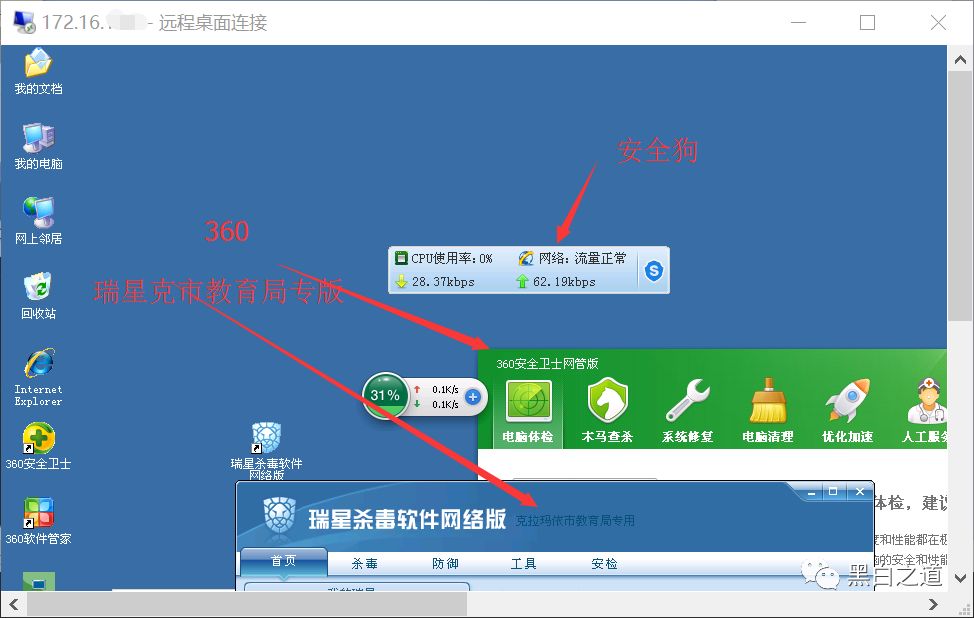 大马上传之后的提权服务器过程就很简单了(虽然服务器有360 教育局专版瑞星杀毒 及 安全狗 但是然并卵 可能是社长太帅 丝毫没遇到拦截和阻力) 过程思路就是如之前社团网站这篇文章一样 传getpass.exe 在大马里面执行读取账号密码即可 详见:http://www.zmnhssn.com/?post=62。