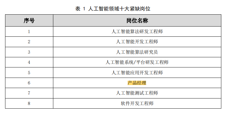 而根据工信部发布的《人工智能产业人才发展报告(2019-2020年)》,预计我国人工智能产业内有效人才缺口达 30 万,供需比严重不平衡。其中,产品经理在AI领域紧缺岗位中排行第 6。