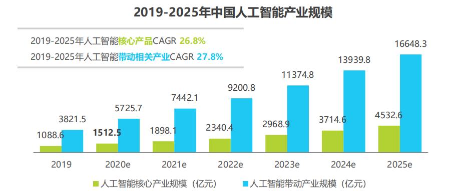 根据艾瑞咨询最新发布的《2020年中国人工智能产业研究报告》,2020年人工智能产业达到超过 1500 亿元规模;到2025年,产业规模预计超过 4500 亿元,增幅将超过 300%。