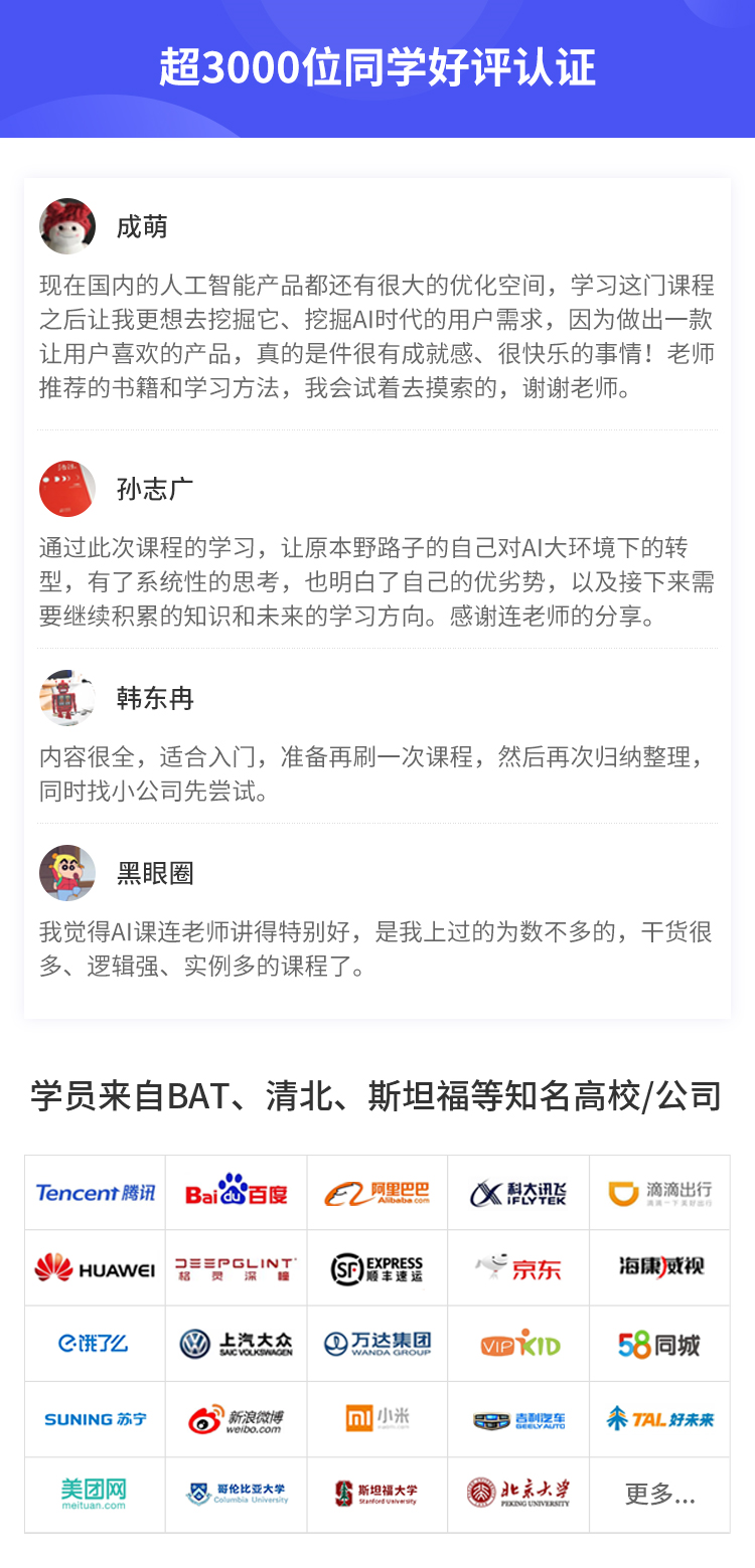 在课程中,连老师将用多年的实战和研究,带大家深入到行业最前沿,不仅讲授自身做AI产品的产品观点、产品打磨流程、AI产品需要的资源、AI产品发布运营等方面的实践;也对大家入门AI产品未来需要深度学习的方向提供了建议。