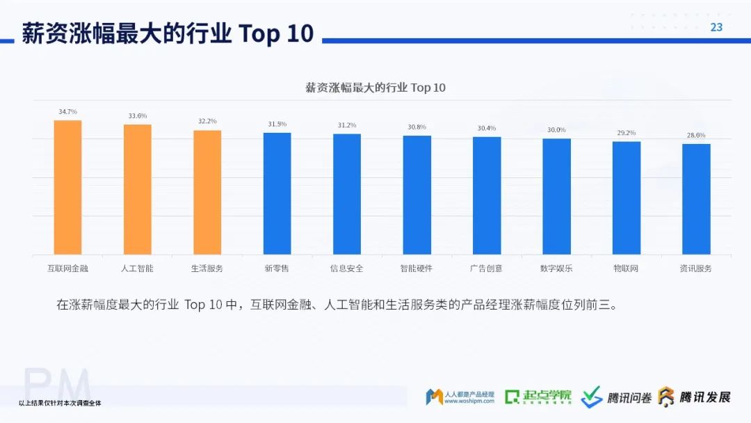 与此同时,在产品经理薪资涨幅最大的行业中,人工智能却凭借着 33.6% 的惊人涨幅高居第 2!