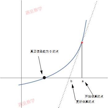 牛顿法假设a 是对方程 f(x) = 0 的解的一个近似. 如果令 b = a - f(a)f′(a)