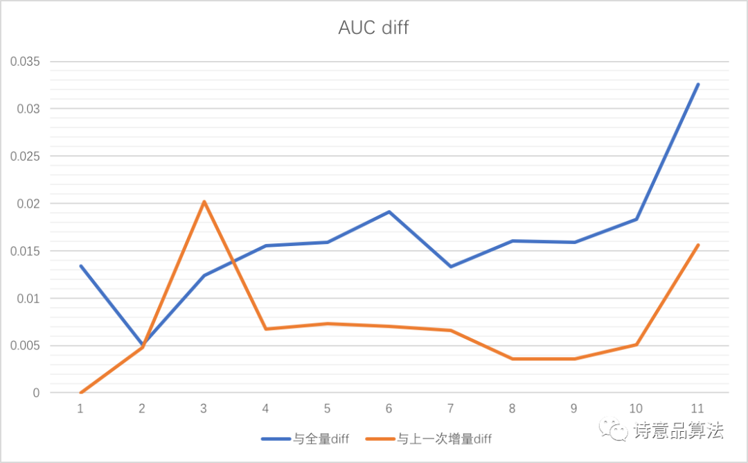 我们可以得到每一次增量训练过程中的最优AUC(或者固定epoch的AUC),与全量版本的AUC和上次增量版本的AUC进行比较,得到离线的AUC diff。这里的AUC评估基于同一份验证集,因此完全可比。下面给出本次增量 VS 全量以及本次增量 VS 上次增量AUC的diff: