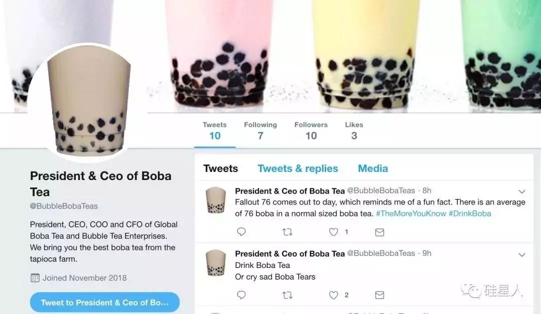 还没从奶茶带来的文化冲击里缓过来的美国推友还为奶茶制作了主页,每天更新一条对奶茶的赞美。