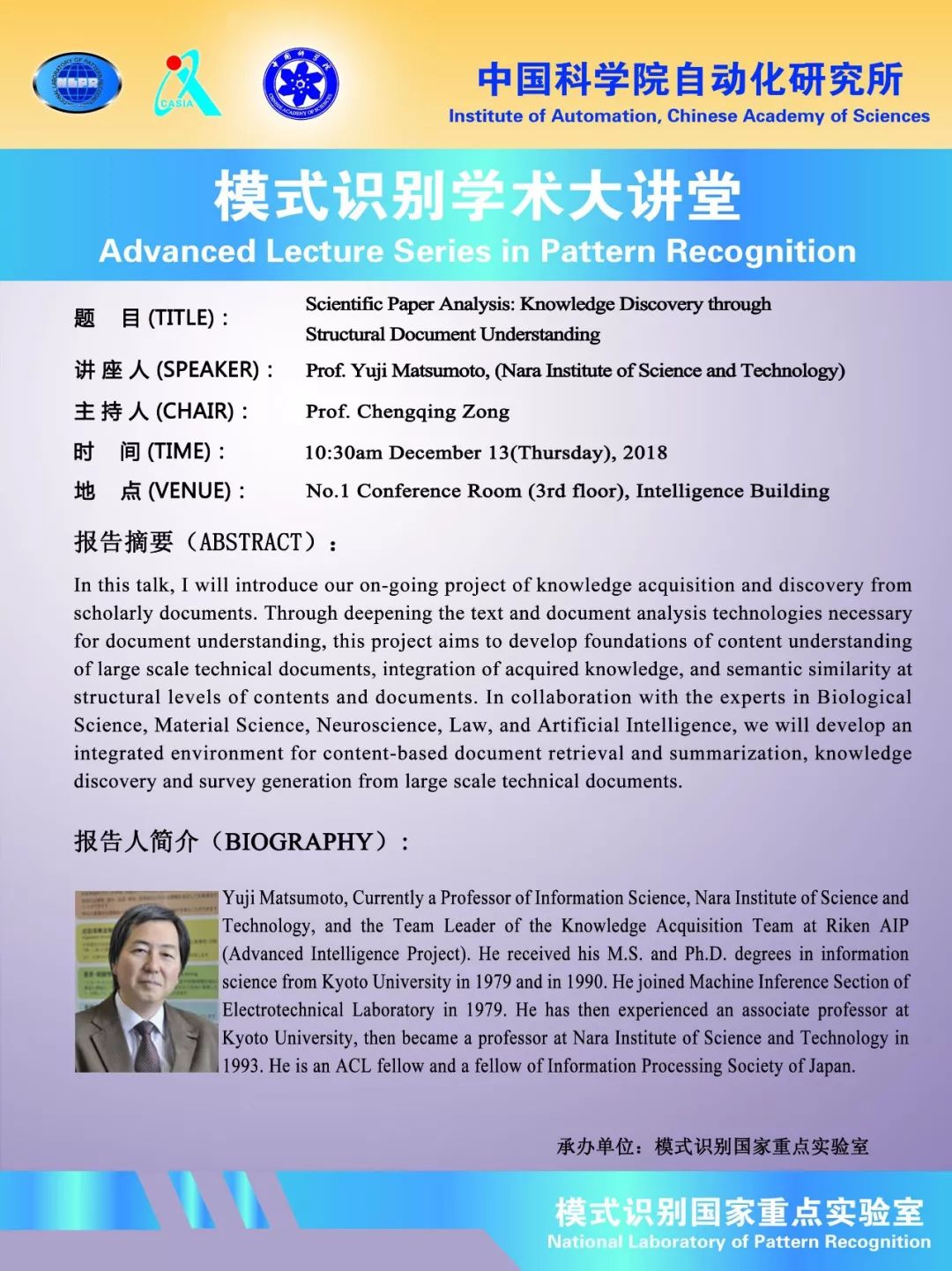 Yuji Matsumoto, Currently a Professor of Information Science, Nara Institute of Science and Technology, and the Team Leader of the Knowledge Acquisition Team at Riken AIP (Advanced Intelligence Project). He received his M.S. and Ph.D. degrees in information science from Kyoto University in 1979 and in 1990. He joined Machine Inference Section of Electrotechnical Laboratory in 1979. He has then experienced an associate professor at Kyoto University, then became a professor at Nara Institute of Science and Technology in 1993. He is an ACL fellow and a fellow of Information Processing Society of Japan.