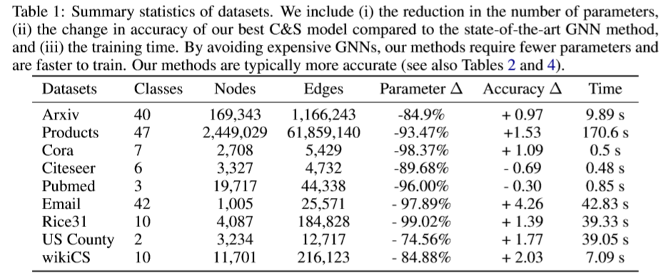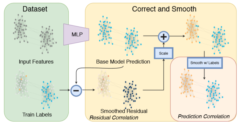 本文展示了许多标准的传导节点网络的分类基准结果,作者通过将忽略图结构的浅层模型与利用标签结构中相关性的两个简单后处理步骤相结合,可以超越或匹配SOTA的GNN的性能,这里主要有两个相关性(i)将训练数据中的残余误差带到测试数据中,用于矫正错误的“误差相关性”(error correlation),以及(ii)一个“预测相关性”,它可以平滑测试数据上的预测。本文称整个过程为矫正且平滑(Correct and Smooth, C&S),后处理步骤是通过对早期基于图的半监督学习方法的标准标签传导技术的简单修改来实现的。