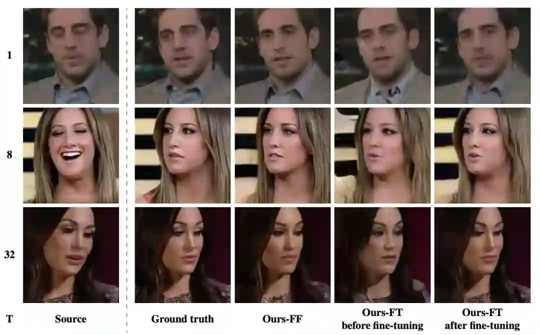 同样,训练帧的数量是T(左边的数字),第1列是示例训练帧。第2列是ground truth图像,后3列分别是我们的FF feed-forward 模型及微调前后的结果。虽然 feed-forward变体的学习更快速,但fine-tuning 最终提供了更好的真实感和保真度。