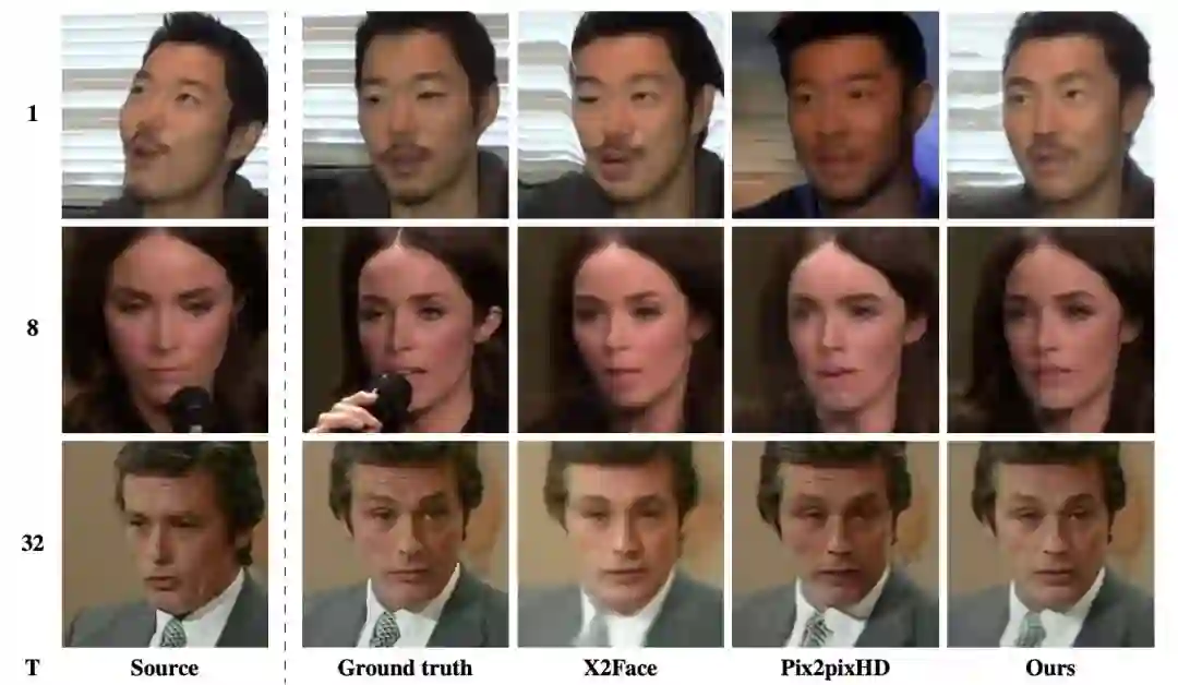 图3:使用1张、8张和32张训练图像时的三个示例。系统采用一个源图像(第1列),并尝试将该图像映射到ground truth帧中的相同位置(第2列)。研究人员将他们的结果与X2Face、PixtopixHD模型进行了比较。