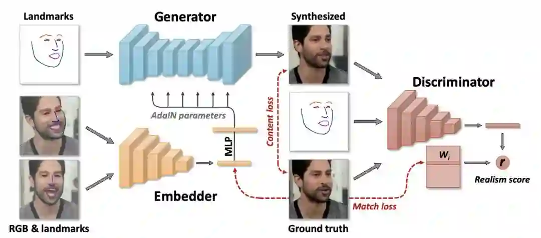 第三,鉴别器网络将来自输入图像的嵌入向量粘贴到目标视频的landmark上,使输入图像能够模拟视频中的运动。