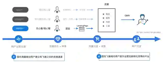 拿到这三个问题我们不能马上就开干,我们还要提炼这个问题带来的核心价值。否则很容易就会出现投入了巨大工作之后,最后的技术产出和业务结果衔接不上,所以说思考不要用蛮力,工作不只靠体力。要去看里面跟自己角色相关的工作在什么地方?以端侧来说,有优势的一点是靠近产品侧靠近用户侧,所以基本展现模式都可以通过产品原型进行抽象,形成体系化。以流量体系建设举例我们要对用户进行分层,比较合理的方式可以用到几个经典模型RFM、AIPL、AARRR及其变种,以便沉淀出承接的技术平台或产品。如流量体系建设我们在思考分层过后,把用户按心智划分之后,又从所属域分为散落在阿里域外的用户和阿里域内的内部用户,从而针对性的设计出两个平台产品。