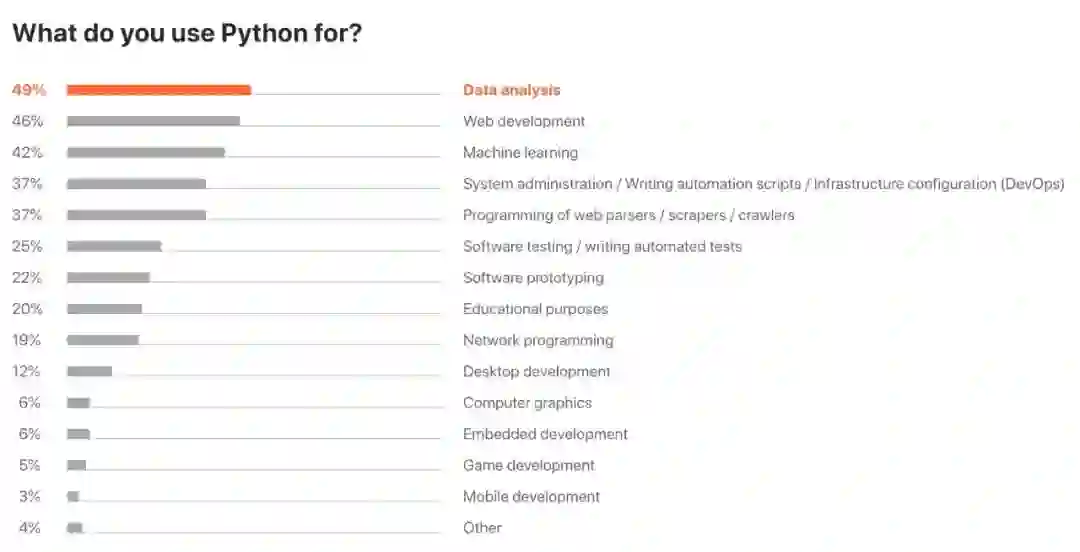 我认为,让 Scala 社区增长 10 倍的方法,不是花 10 倍的精力去讨论现有的语言语法,不是花 10 倍的精力去讨论函数式编程和面向对象编程,也不是花 10 倍的精力去让我们已经类型安全的代码更加类型安全。相反,我们能应该通过包容性地扩展该语言,让那些以前从未接触过它的开发人员使用它:新手、非程序员、命令行工具人员、iOS 开发人员等等。如果我们看看 2019 年的 Jetbrains Python 开发者调查,我们就可以看到 Python 语言在不同领域的使用广度: