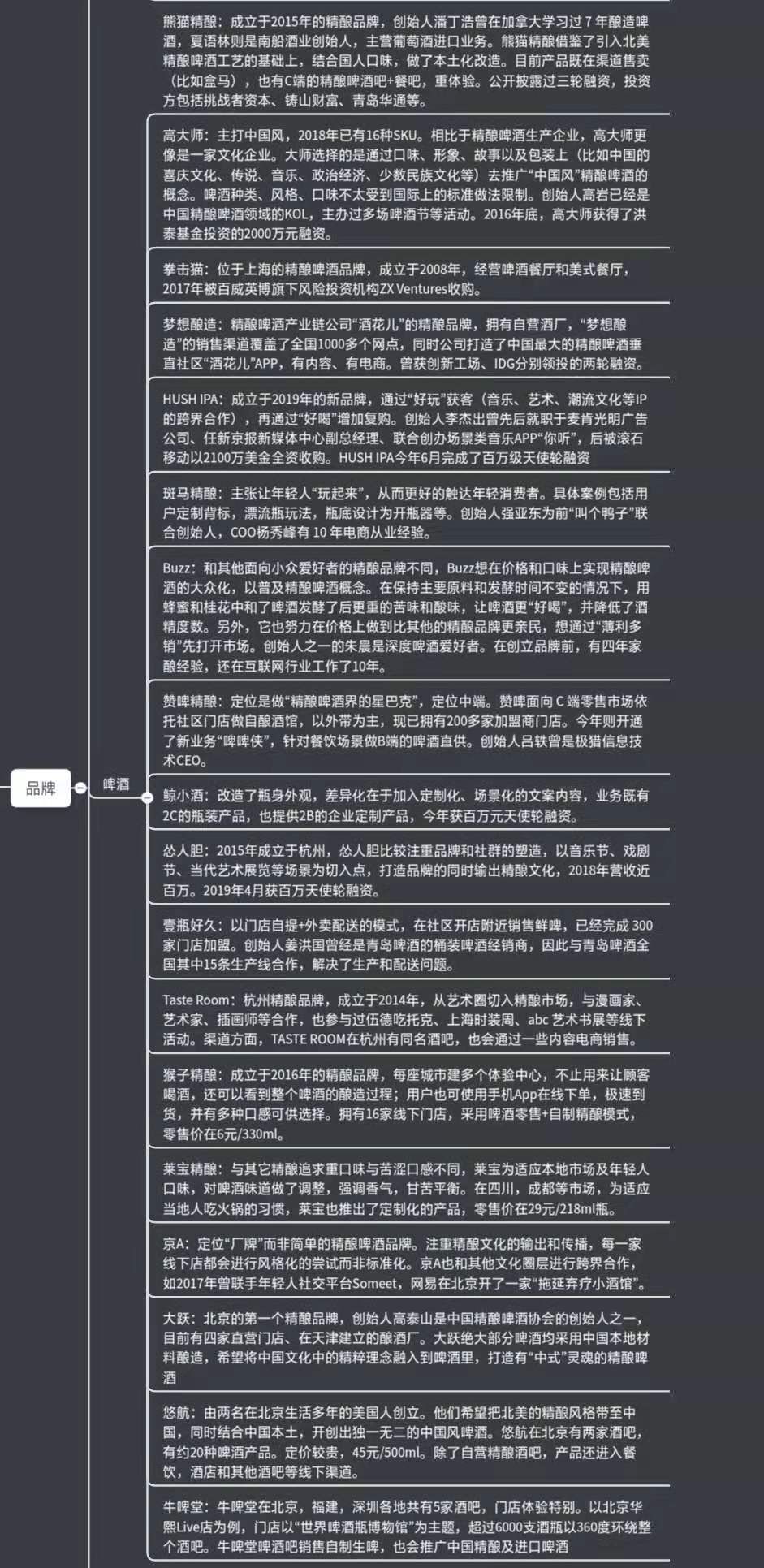 熊猫精酿公开披露过三轮融资,投资方包括挑战者资本、铸山财富、青岛华通等;高大师在2016年底获得了洪泰基金投资的2000万元融资;拳击猫于2017年被百威英博旗下风险投资机构ZX Ventures收购;梦想酿造(酒花儿)曾获创新工场、IDG分别领投的两轮融资;精酿品牌 HUSH IPA、鲸小酒和怂人胆今年分别获百万元天使轮融资。