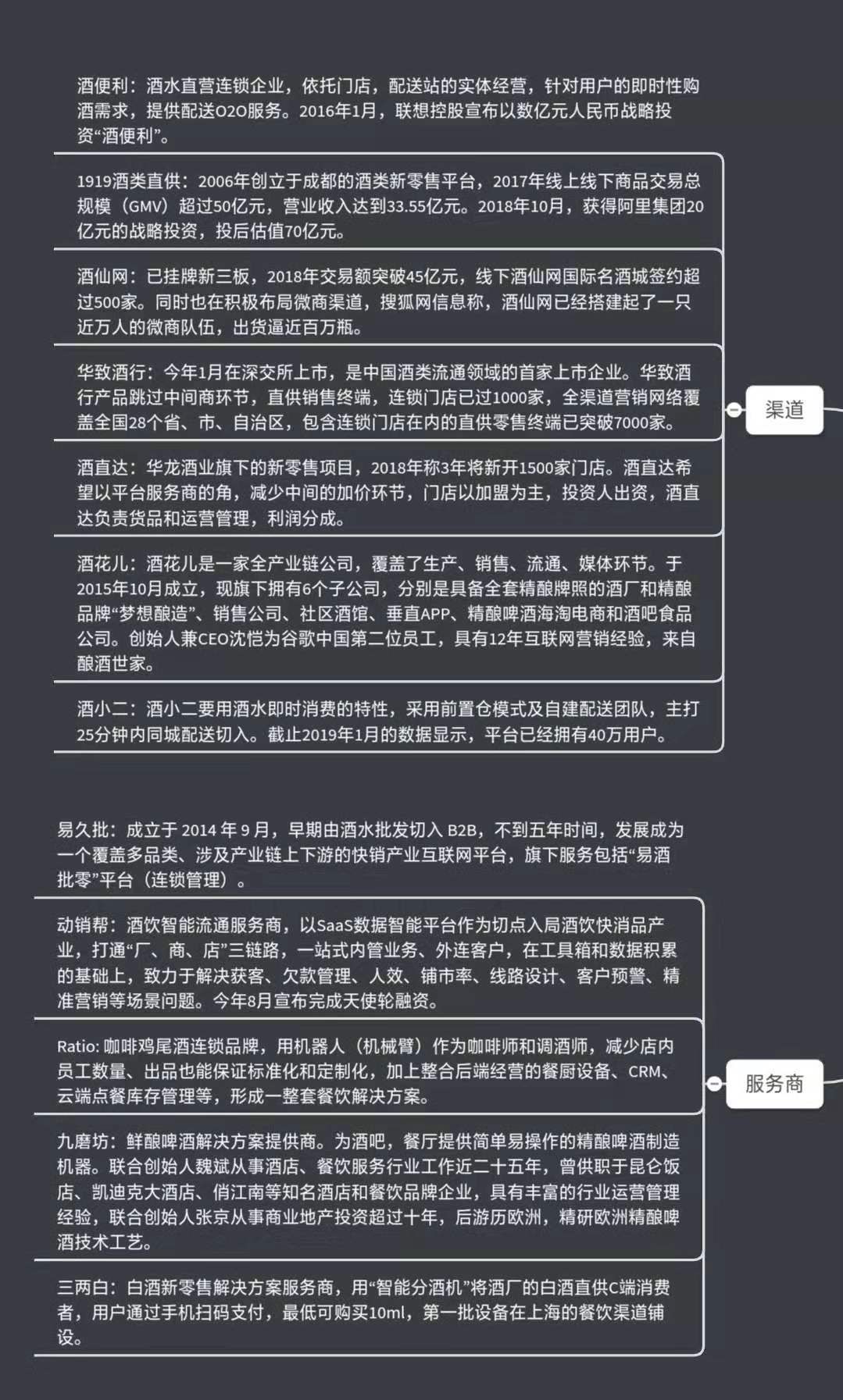 渠道之外,也有一些企业为品牌/渠道/供应商提供服务,比如成立于2014年的易久批,从酒品类切入B2B,后逐渐拓展至全品类服务;在餐饮渠道,也出现了“三两白”这样的零售解决方案服务商,用分酒机解决消费者的“来一小杯”需求。