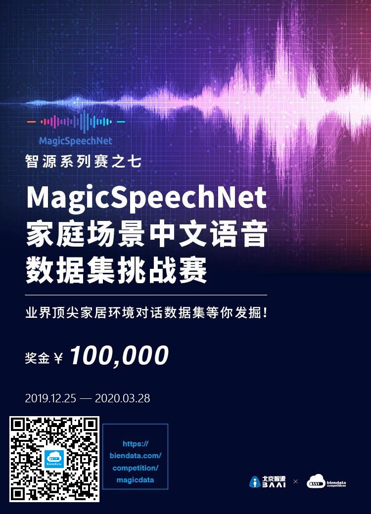 2019 年 12 月,北京智源人工智能研究院联合爱数智慧和数据评测平台 biendata,共同发布了“智源—MagicSpeechNet 家庭场景语音数据集挑战赛” (2019 年 12 月 — 2020年 3 月),总奖金为 10 万元。参赛者需要使用比赛提供的真实家庭环境中的双人对话音频数据,训练并优化语音识别(ASR)模型。比赛和数据复制下方链接查看,或点击“阅读原文”。