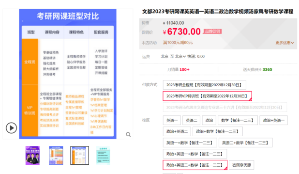 以文都考研为例,在其天猫官方旗舰店,其政治英语数学三门公共课开设的2023考研VIP特训班售价6730,商品详情页面介绍改班型区别于普通全程班,其享有学习计划、学管督学、心理疏导等服务。